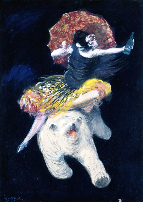 A young woman is riding a bear that is moving energetically. She holds a parasol in one hand and brandishes a bottle of anise in the other.