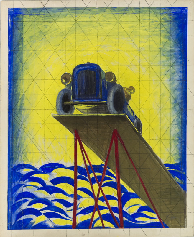 The idea is to demonstrate that this vehicle has perfect grip on the road and that its brakes don't fail. At first, Cappiello thinks of the mechanic working under the car. But he prefers to put the car in a perilous situation above the sea. In the sketch that follows these preparatory drawings, the driver can clearly be seen realizing the situation in complete calm.