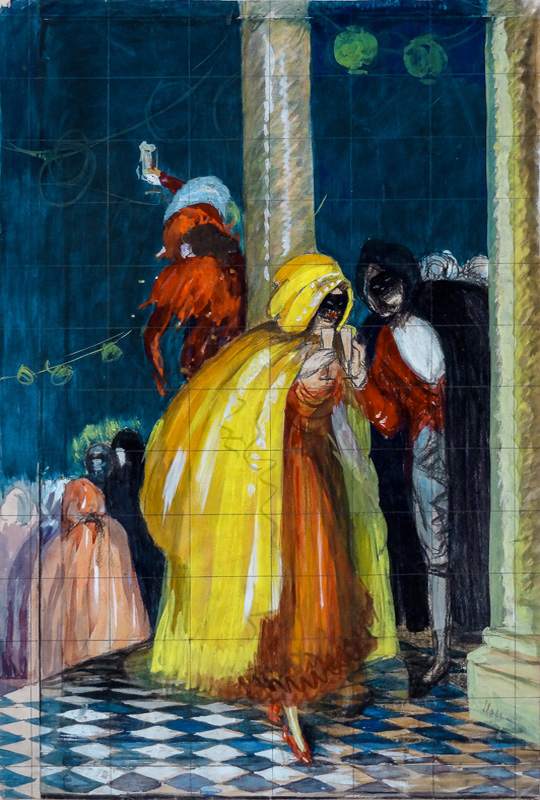 At a masquerade ball, like in Venice, a couple clinks their champagne flutes.