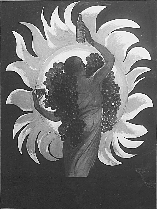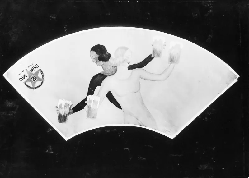 An elephant with a towel around its neck pours a mug of beer on its back to cool off. Note the humorous touch in the knot tied on the animal's tail. (Same detail on the monkey in Oporto Don Luiz)