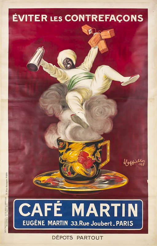 "In the poster for Café Martin, Cappiello created, by personifying the aroma, the essence of coffee, the 'genie of coffee,' released like the genie of the lamp. The Turk sailing on the fragrant vapors escaping from a richly decorated cup, the heavy and rich atmosphere suggest the charm, mystery, and refinement of the Orient of the Thousand and One Nights. The strength of Cappiello's poster lies in the balance of forms: the inertia of the cup despite the movement of the decor and the elegant and powerful arabesque of the steam coiling around the character. The artist's approach is the same for Café Martin and for the Bitter Campari." [in Cappiello. Caricatures posters paintings.1981]