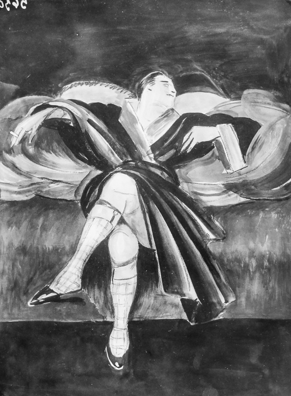 A man in a dressing gown and slippers, cosily seated on a sofa, is smoking a cigarette. He is wearing beautiful socks.