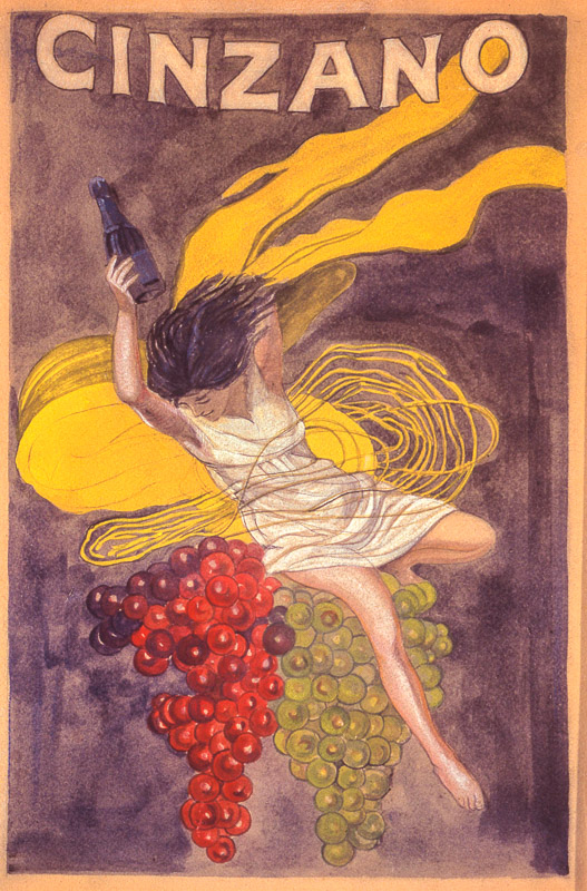 A woman in light clothing, her black hair blowing in the wind, is sitting on two large bunches of grapes. She is holding up a bottle of Cinzano. A swirl near her face, combined with the wind, suggests the beginnings of intoxication.