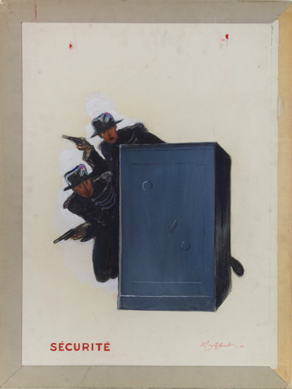 Behind a safe are hidden two policemen guarding with a weapon in hand.