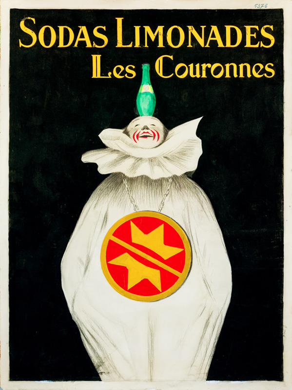 A clown is carrying a soda bottle on his head. In the initial sketch made for a sparkling water brand (black and white photo), drops were spurting from the open bottle.