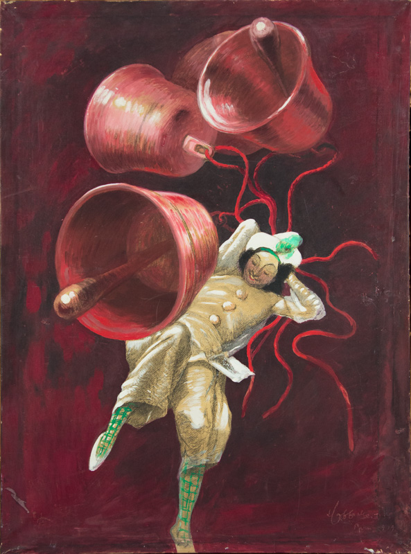 A pierrot holds the ropes of four large bells. The village of Courville near Reims made headlines during the 1914-1918 war. It was invaded several times, and the church was heavily damaged. The bells also have their own history. In 1793, the Revolutionary Committee decided to melt them down to make cannons and reuse their ropes for ships in Brest. These bells were certainly a source of inspiration for Cappiello, but the connection to chocolate is not obvious.