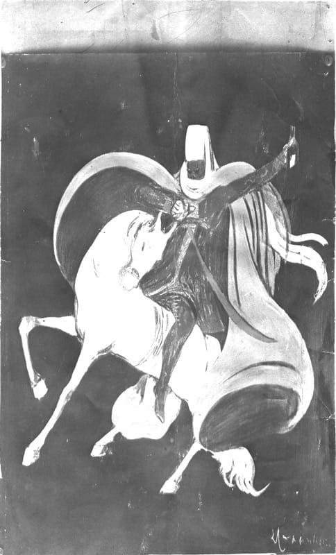 An Arab knight on his white horse stops his mount to show us a bottle of brandy.