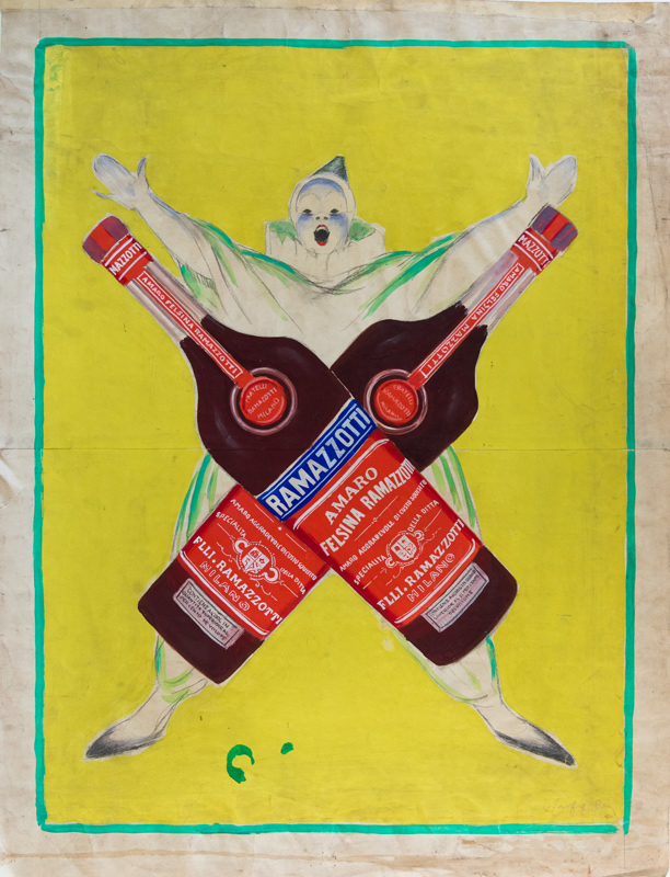 A white pierrot spreads his arms above two bottles of Amaro Felsina Ramazzotti arranged in a cross.