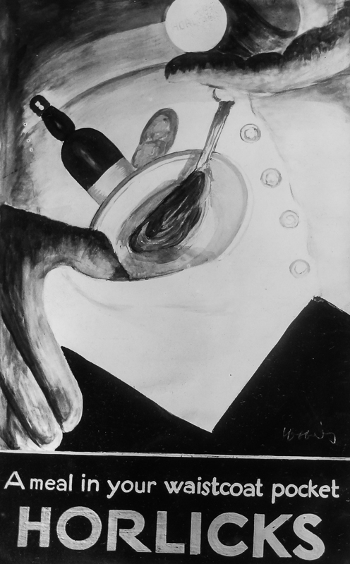 A hand holds a box of Horliks, the other spreads open the vest pocket from which emerge a cutlet, a bottle, and a loaf of bread.