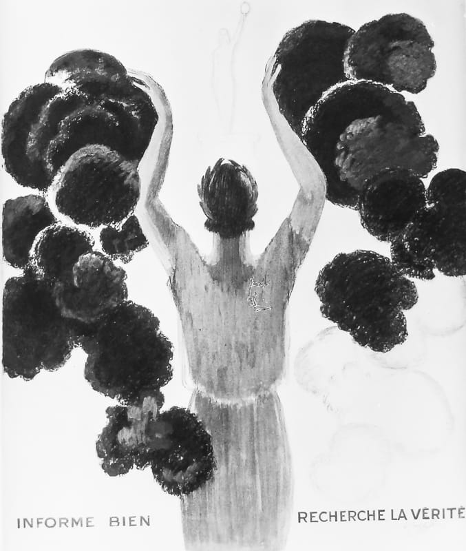 A Marianne seen from behind is pushing away black clouds.