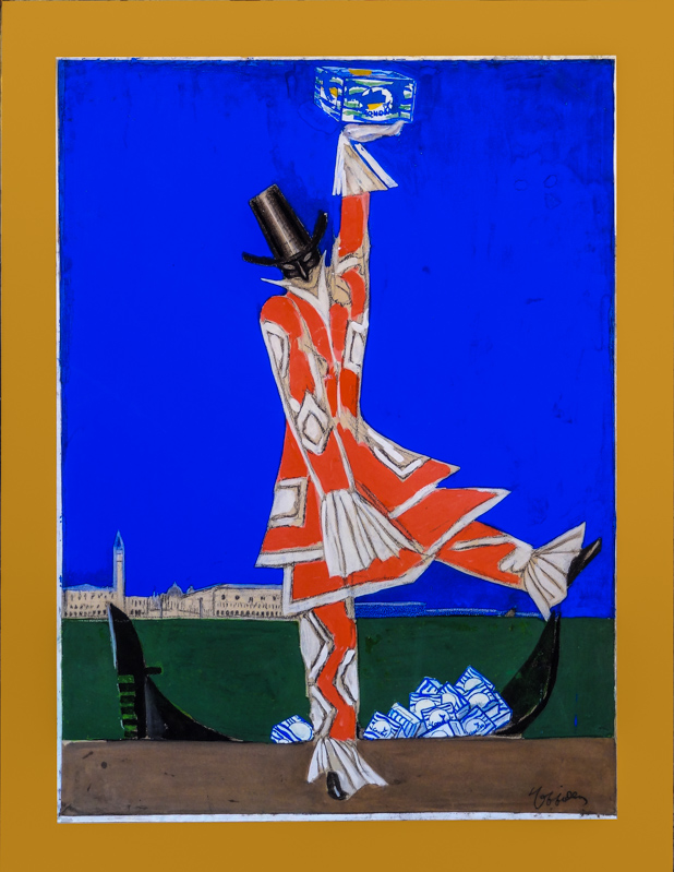 At the Venice Carnival, a disguised gondolier moored his gondola in front of St. Mark's Square. He is holding up one of the biscuit boxes that fill his boat. A variant is intended to promote wine (See black and white photo).