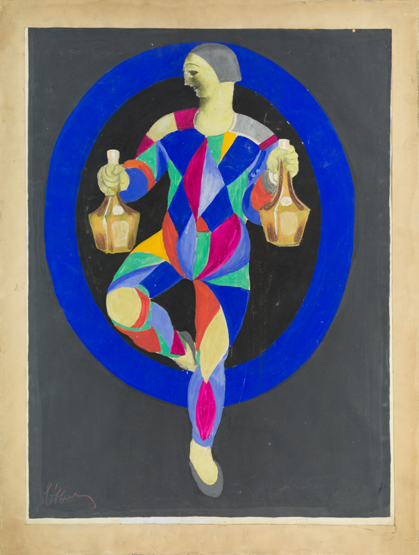A Harlequin emerges from a frame with two liquor bottles in hand.