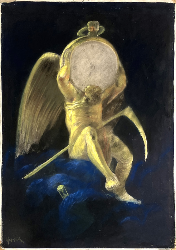 Chronos, god of time, sitting on a cloud with his pair of wings and hourglass, wears a pocket watch above his head. This idea was taken up a little later in 1928 in a sketch for the same brand.