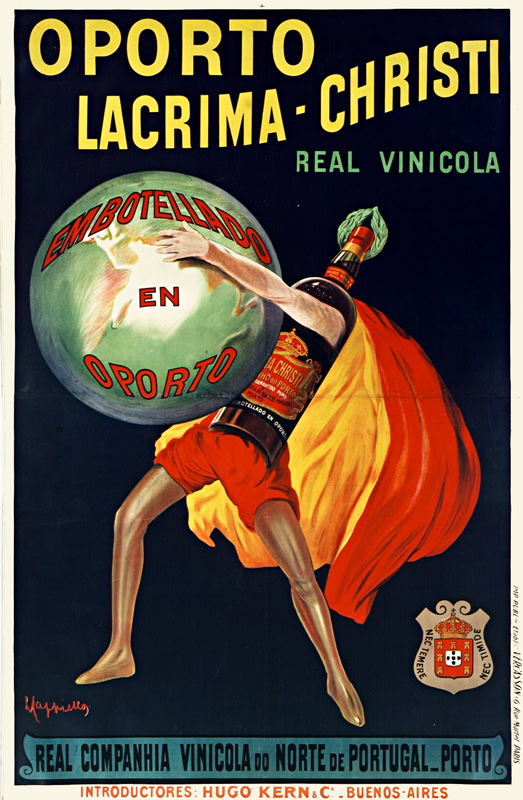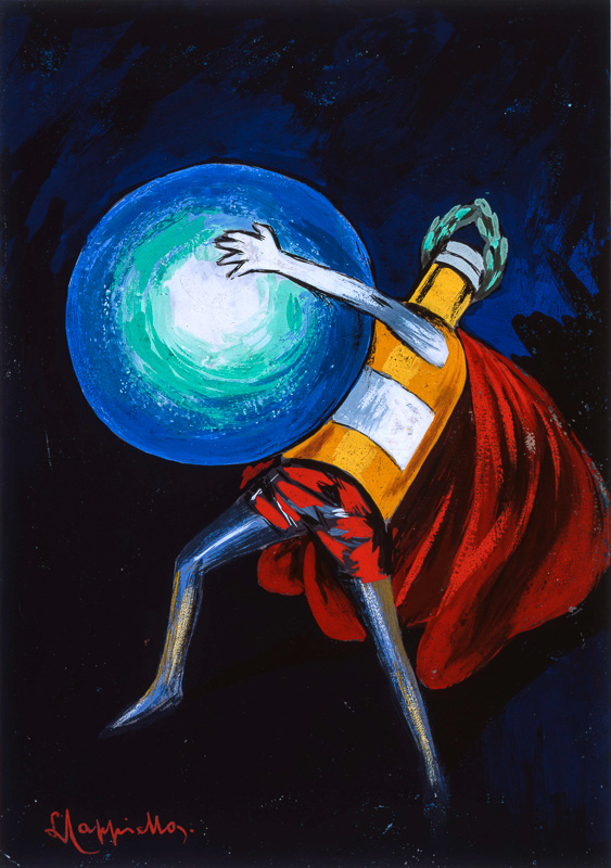A man with a red cape, whose body is a bottle, holds the world in his hands. On his head rests a laurel wreath. At the bottom of the poster is the name of the importer in Buenos-Aires.