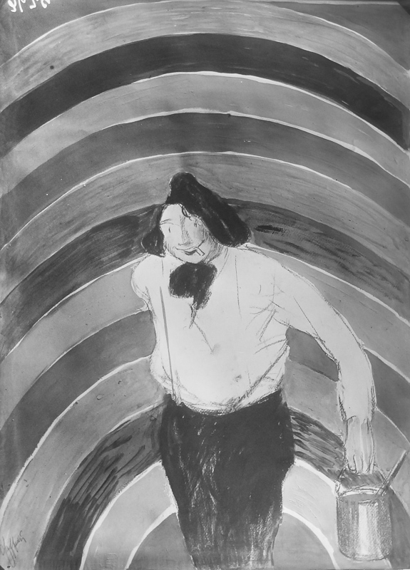 A painter, wearing a beret with a cigarette in his mouth, holds an open paint can with a brush inside. Behind him, colorful bands in an arc.