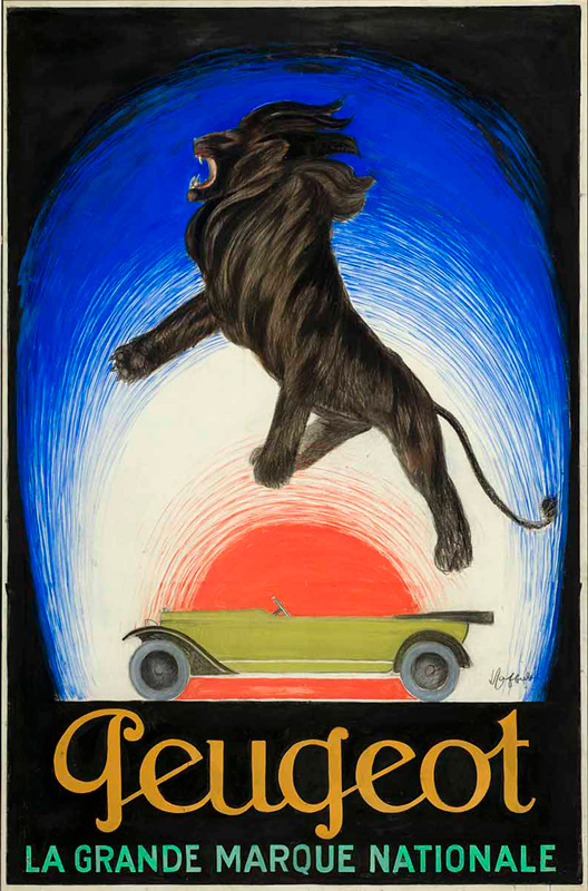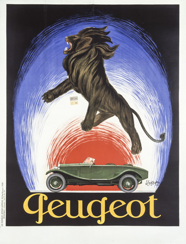 Under the conquering lion, emblem of the brand, a car resembling a Peugeot 156, with elongated shapes to give an impression of speed, stands out against a background in the colors of France.