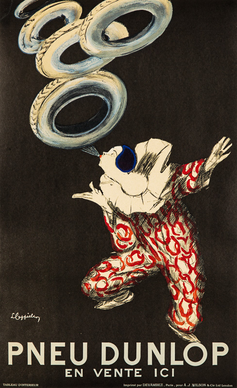 A clown's breath keeps a tire in the air. In the preliminary sketch, the clown was inflating the tire by mouth (See black and white photo).