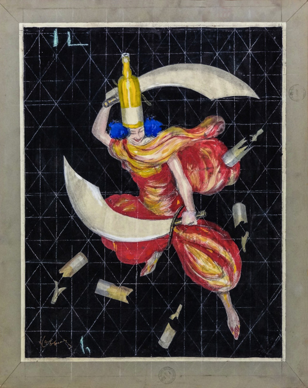 A witch wearing harem pants, scimitars in hand, beheads bottles of Strega. She wears on her head one of those bottles with the bright yellow color so appreciated by connoisseurs.
