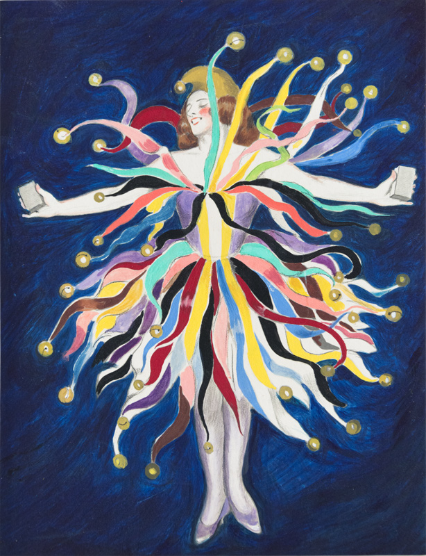 A harlequin, dressed in a multicolored jingle bell dress, showcases the dye she holds in each hand, which allowed her to obtain this pretty dress.