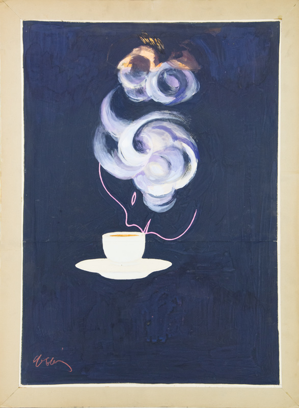 A woman's head, barely sketched, is drinking a cup of tea. Her hair, done up in large curls, evokes the smoke of the beverage.