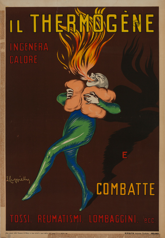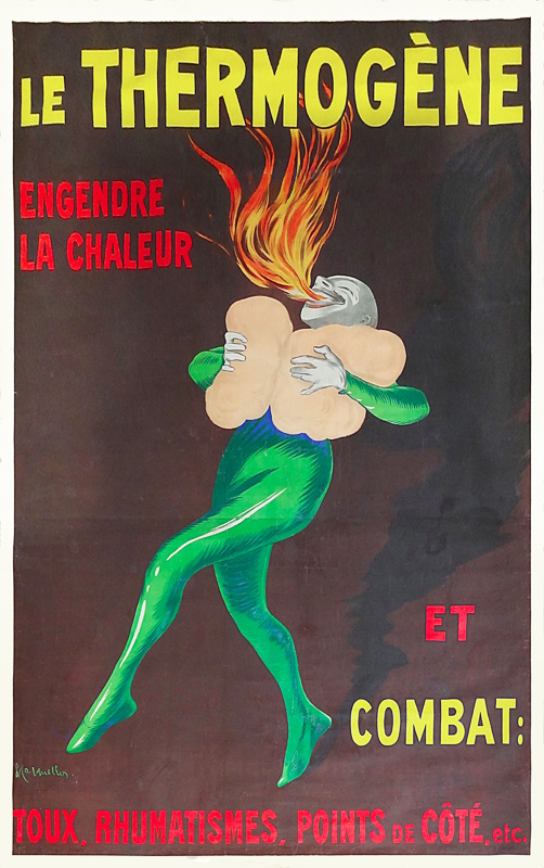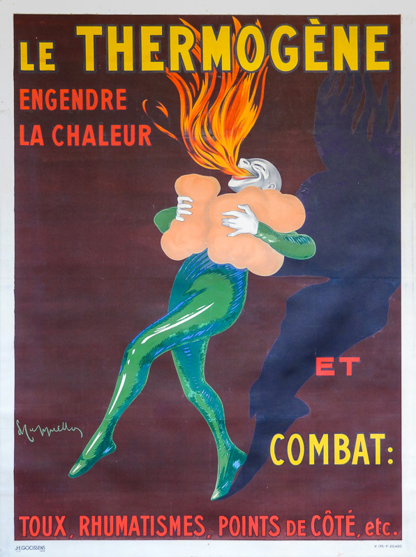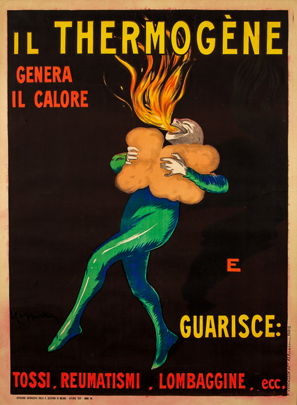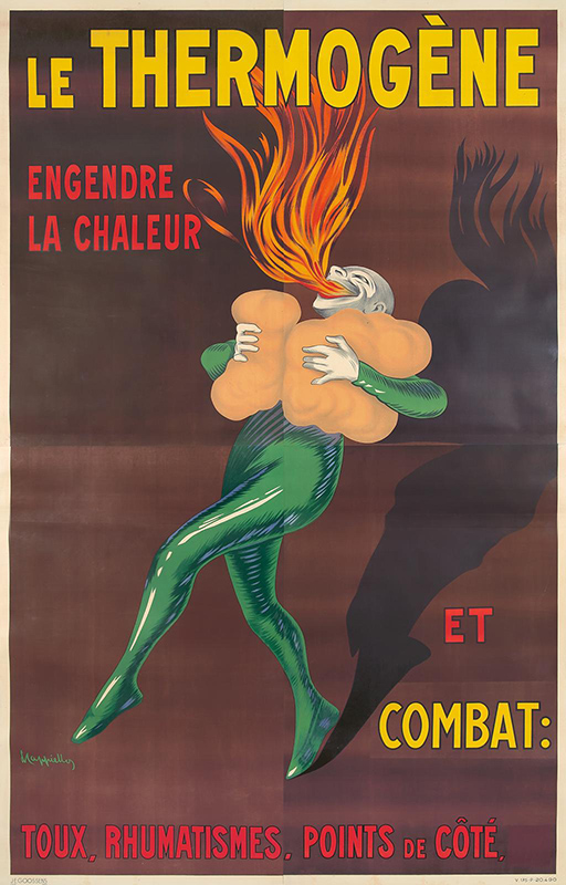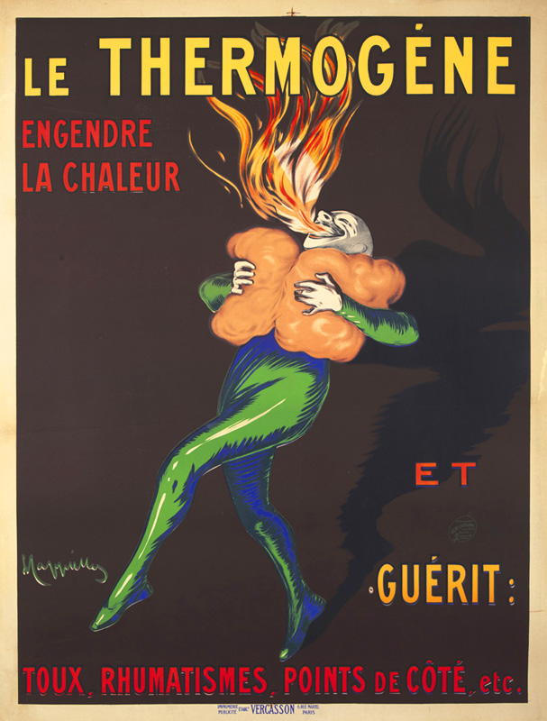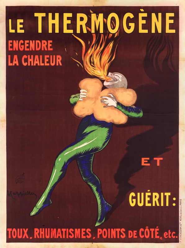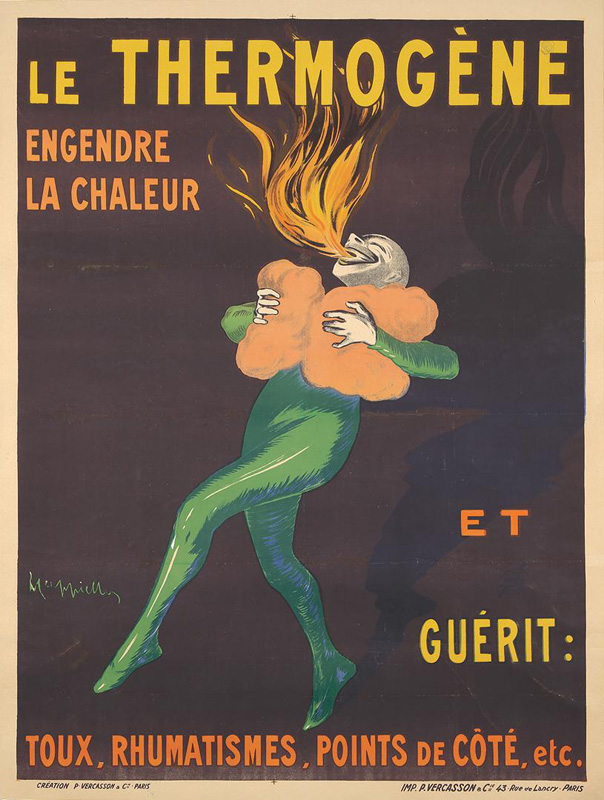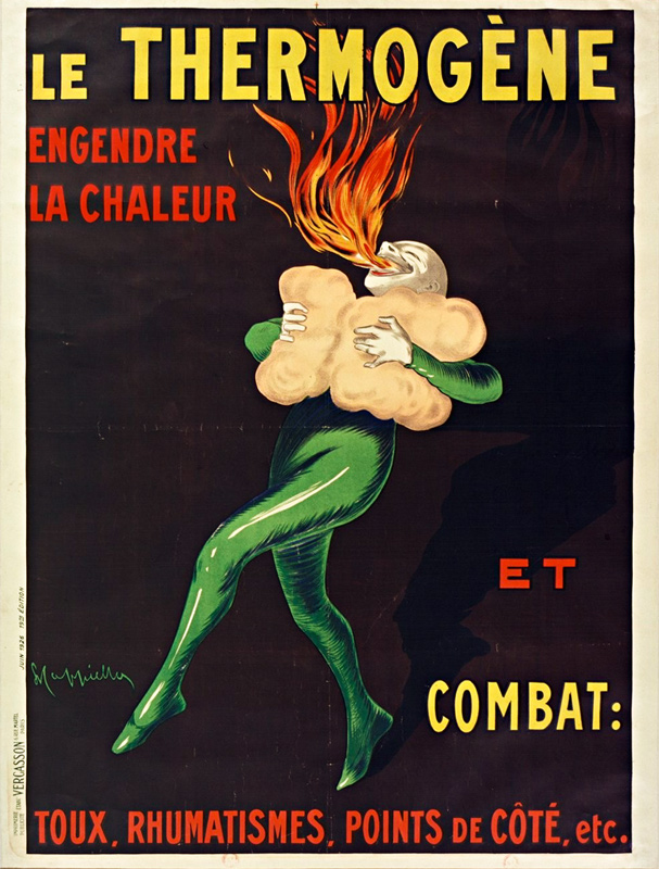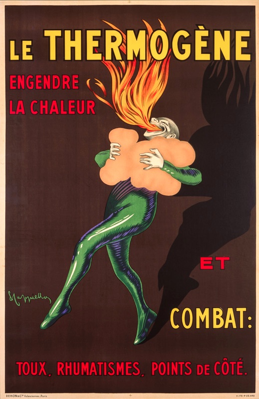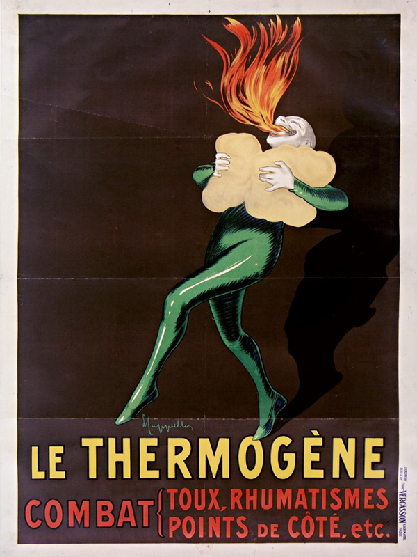 "One day Pierrot, feeling a tightness in his lungs, Quickly applied the Thermogène wadding. The effect was surprising, and our friend Pierrot Saw sheaves of fire burst from his throat." [in Cappiello. Caricatures Posters Paintings and Decorative Projects. Grand Palais 1981]