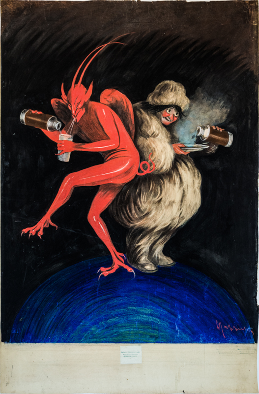 Standing on Earth, a winged red devil pours himself a cool drink from his Thermos, while an Eskimo, warmly dressed, has hot soup with his.
