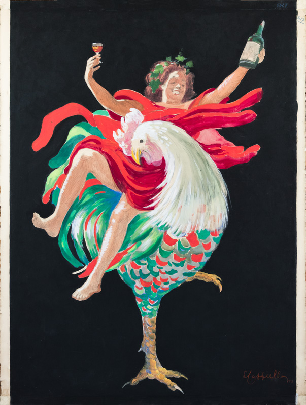 A young Bacchus sitting on a Gallic rooster, brandishes a bottle and a glass of vermouth. In its initial version (Cf black and white photo) Bacchus was looking at the bottle instead of brandishing it.
