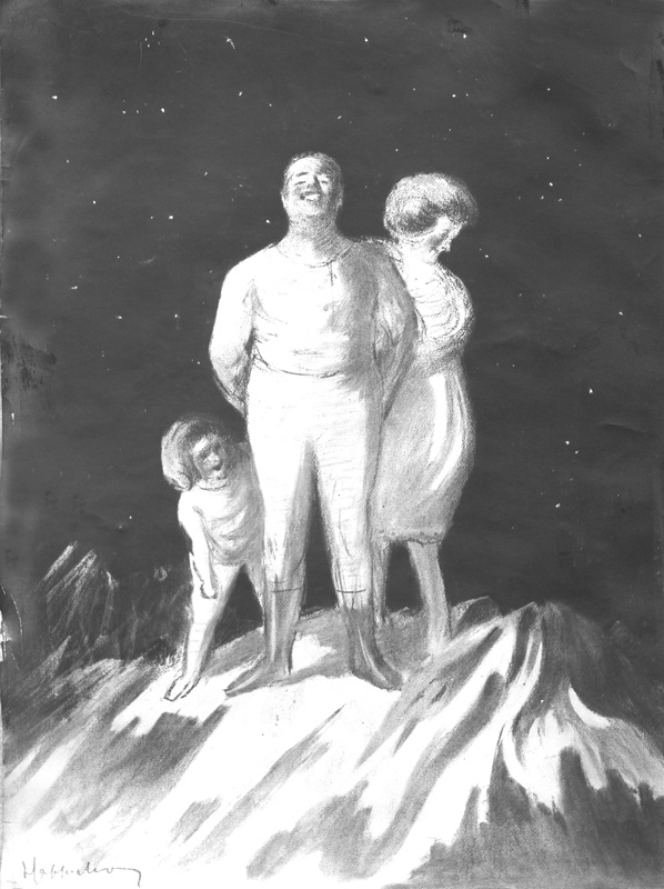 Un couple et leur enfant sont au sommet d'une montagne enneigée. Ils se trouvent bien confortablement habillés malgré le froid extérieur avec leur sous-vêtement.
