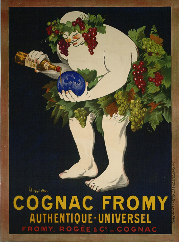 Un plantureux Bacchus , vêtu de feuilles de vignes et de grappes de raisin, arrose la planète terre avec le contenu de sa bouteille de cognac.