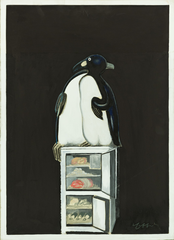 Deux pingouins se pressent sur un réfrigérateur ouvert pour pouvoir profiter ensemble de la fraîcheur.