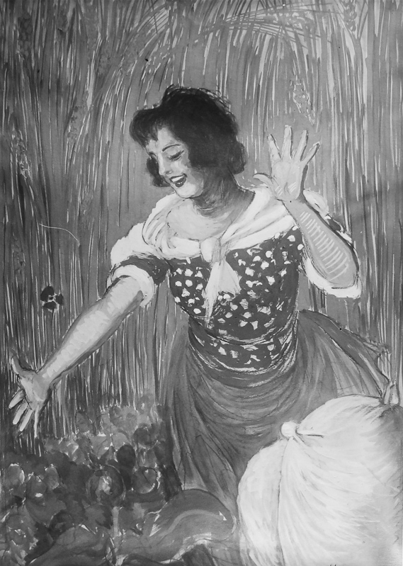 Une jeune femme à côté d'un sac d'engrais montre la très belle culture qu'elle a fait pousser.