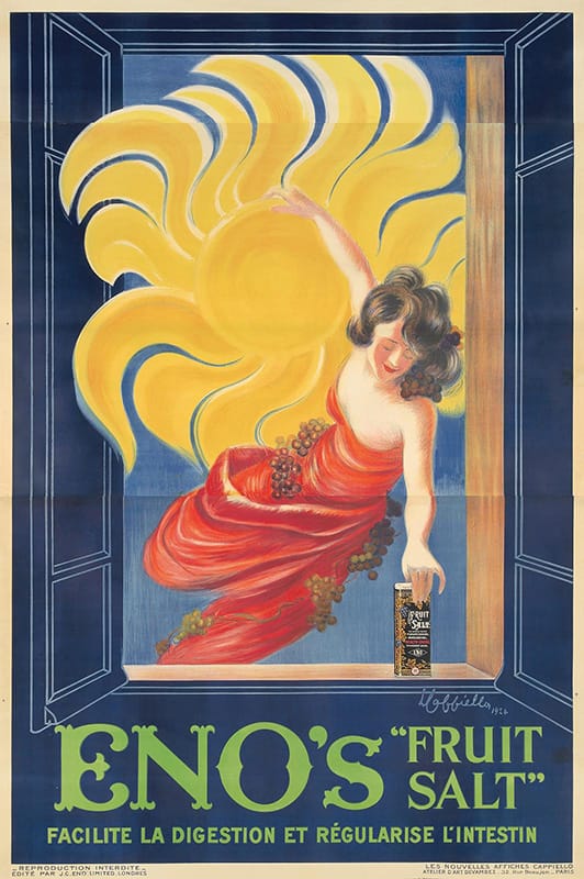 Une femme arrive par la fenêtre ouverte et dépose sur le rebord un flacon d'Eno's "Fruit Salt". Elle tient contre elle un soleil. C'est le soleil de l'amélioration, voire de la guérison.