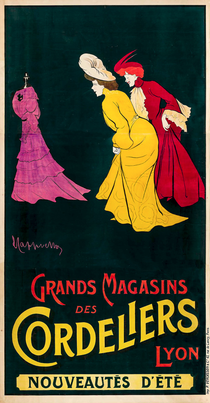 Jeanne Granier et Réjane, deux célèbres actrices particulièrement élégantes, regardent avec admiration et envie, une robe sur un mannequin. "Dans cette affiche, Cappiello met en scène Jeanne Granier et Réjane. Les deux actrices admirant une toilette avec convoitise, pourraient tout à fait sortir d'un dessin fait au cours d'une représentation théâtrale, ou d'une quelconque occasion Ies réunissant. La robe tentatrice pourrait être remplacée par tout autre objet, il n'y a pas dans cette affiche de mise en scène publicitaire spécifique. L'argument de vente est d'une autre nature : il ne s'agit ni de surprendre, ni de charmer, mais bien plus de suggérer en utilisant un processus psychologique plus subtil. Granier et Réjane sont les deux actrices les plus parisiennes de l'époque, pour la Province qui les reçoit occasionnellement au cours de tournées, elles représentent le chic, l'élégance et cette affiche suggère aux provinciales un moyen de s'identifier à I'image de la Parisienne à la mode, en achetant dans ce magasin. La vedette, aujourd'hui encore et parce qu'elle est le symbole d'une société, d'un art de vivre, d'une mode, sert de vecteur publicitaire à toute branche de I'activité économique." [in Cappiello 1875-1942 : Caricatures, affiches, peintures et projets décoratifs, 1981]