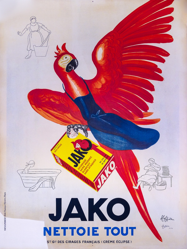 Un perroquet serre dans ses griffes un paquet de lessive Jako. Avec trois dessins en filigrane dans le fond, on constate que cette lessive sert pour le linge ainsi que pour la toilette et la vaisselle.