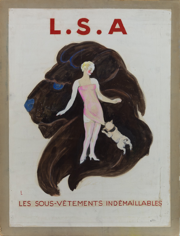 Dans une deuxième esquisse (1934020E), le cacatoès est remplacé par un gros chien avec toutes ses dents. Là encore la femme n'est pas surprise, sa combinaison résiste.