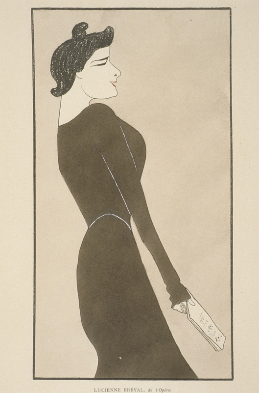 NA01 : Lucienne Bréval de l'Opéra, publié dans l'album Nos Actrices de Cappiello, page 9, édition de La Revue blanche.