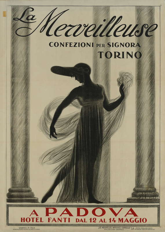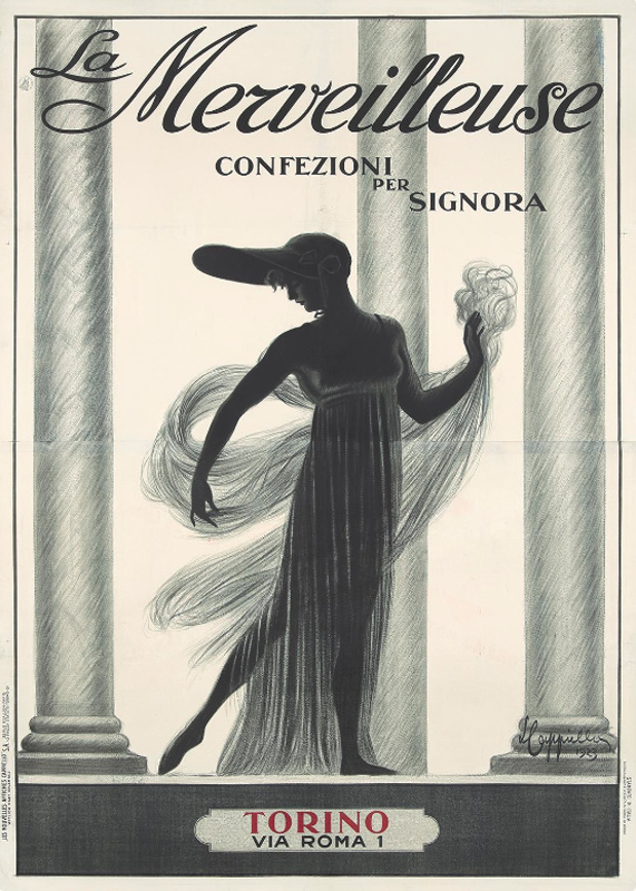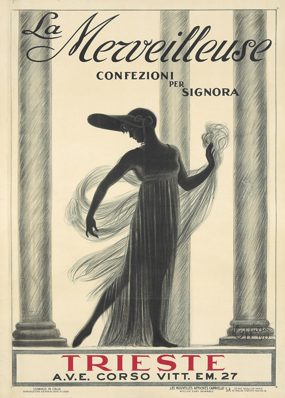 Une "merveilleuse" déambule au milieu d'une colonnade. Nota : En 1930, Carlo Emilio Nicco fait une nouvelle affiche pour La Merveilleuse. Il reprend la silhouette de l'affiche de Cappiello qu'il a mis dans le coin supérieur droit. Sepo fait de même en 1934 pour Tortonese/Torino. Mais la silhouette est en grand, en arrière-plan. Quels hommages à Cappiello.