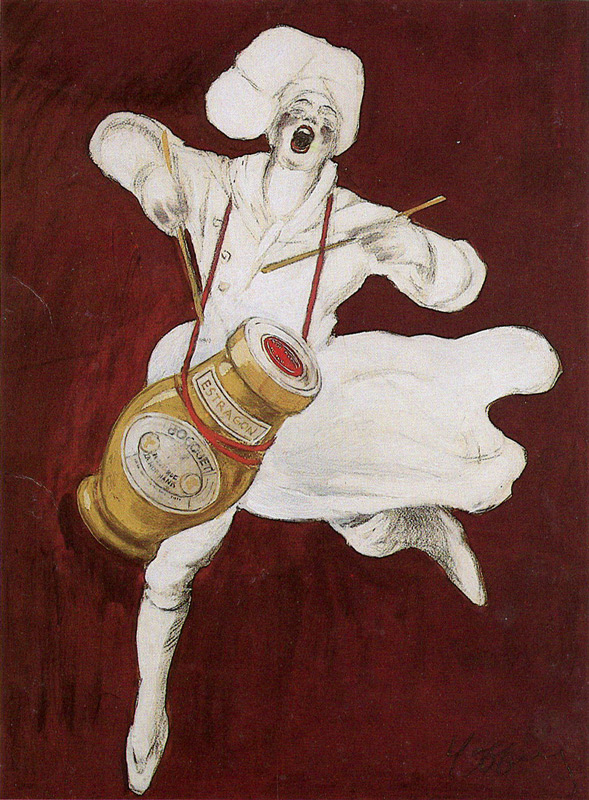 Un cuisinier utilise un gigantesque pot de moutarde pendu à son cou comme tambour. Il bat le rappel et interpelle les consommateurs pour qu'ils viennent déguster le merveilleux produit !