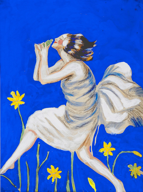 Une femme avance parmi les fleurs. Elle porte au visage un flacon dont le parfum l'enivre.