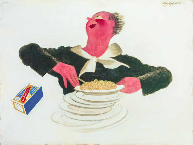 Un gourmand prend une assiette pleine de pâtes. Cette maquette fait suite à une esquisse pour Lustucru (Cf. photo noir et blanc).