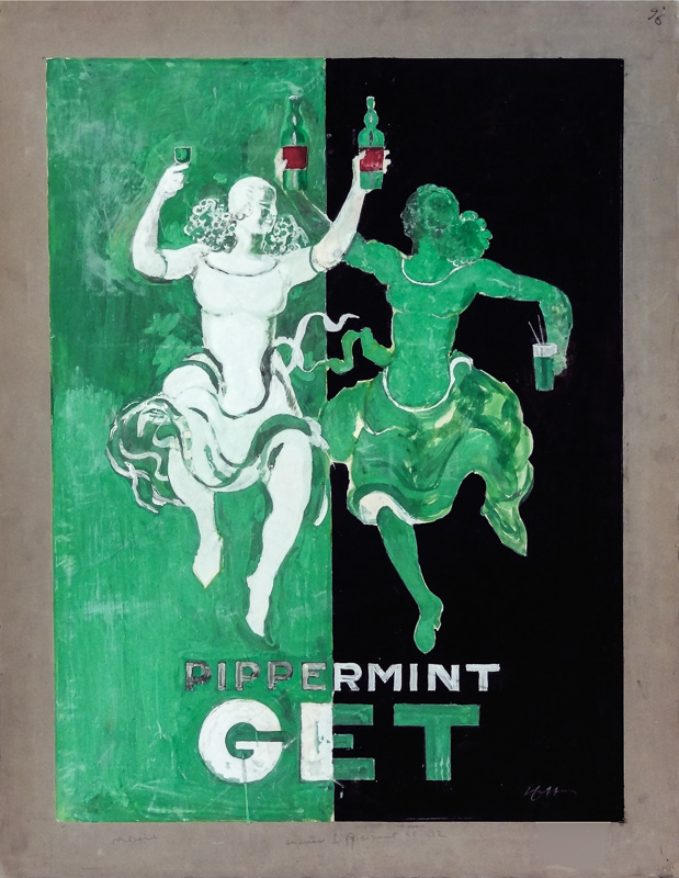 Deux femmes, une blanche et une verte sur fond vert et noir respectivement, dansent avec un verre et une bouteille de Pippermint Get à la main.