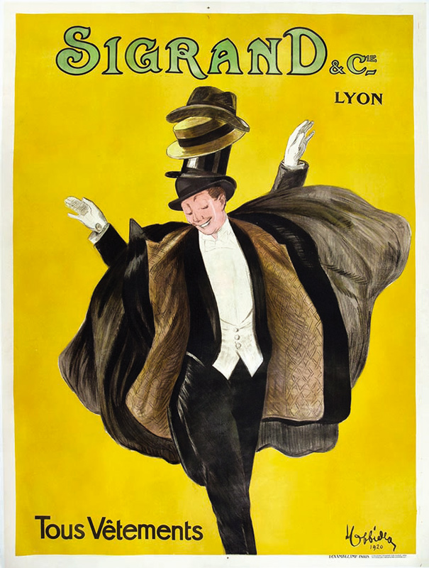 Un homme en habit porte sur lui tous les vêtements qu'il a achetés : divers manteaux, chapeaux, gants ... et montre ainsi l'excitation que lui procurent ses acquisitions.